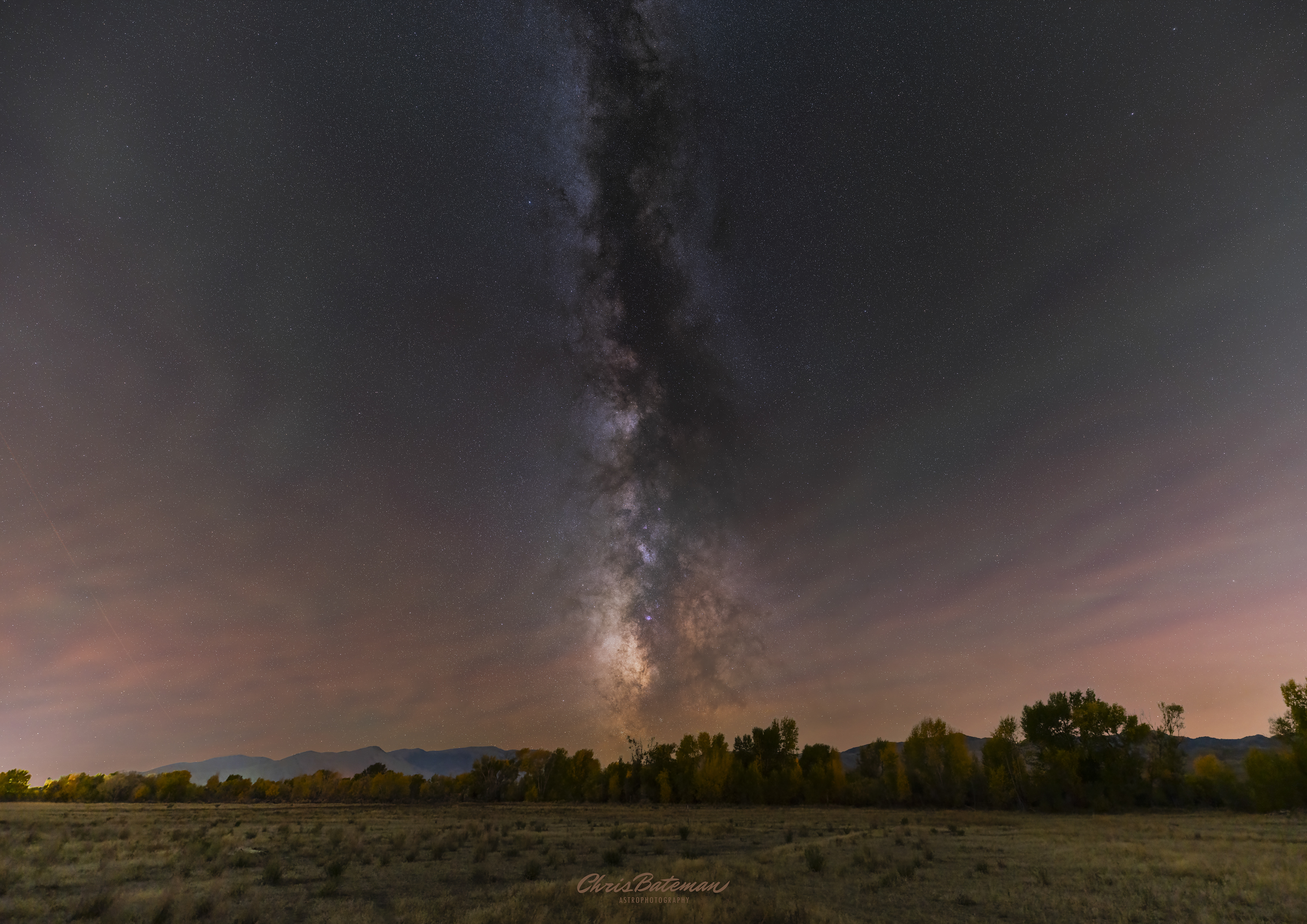 A dry, simple, grassland lies beneath a majestic and colorful sky.