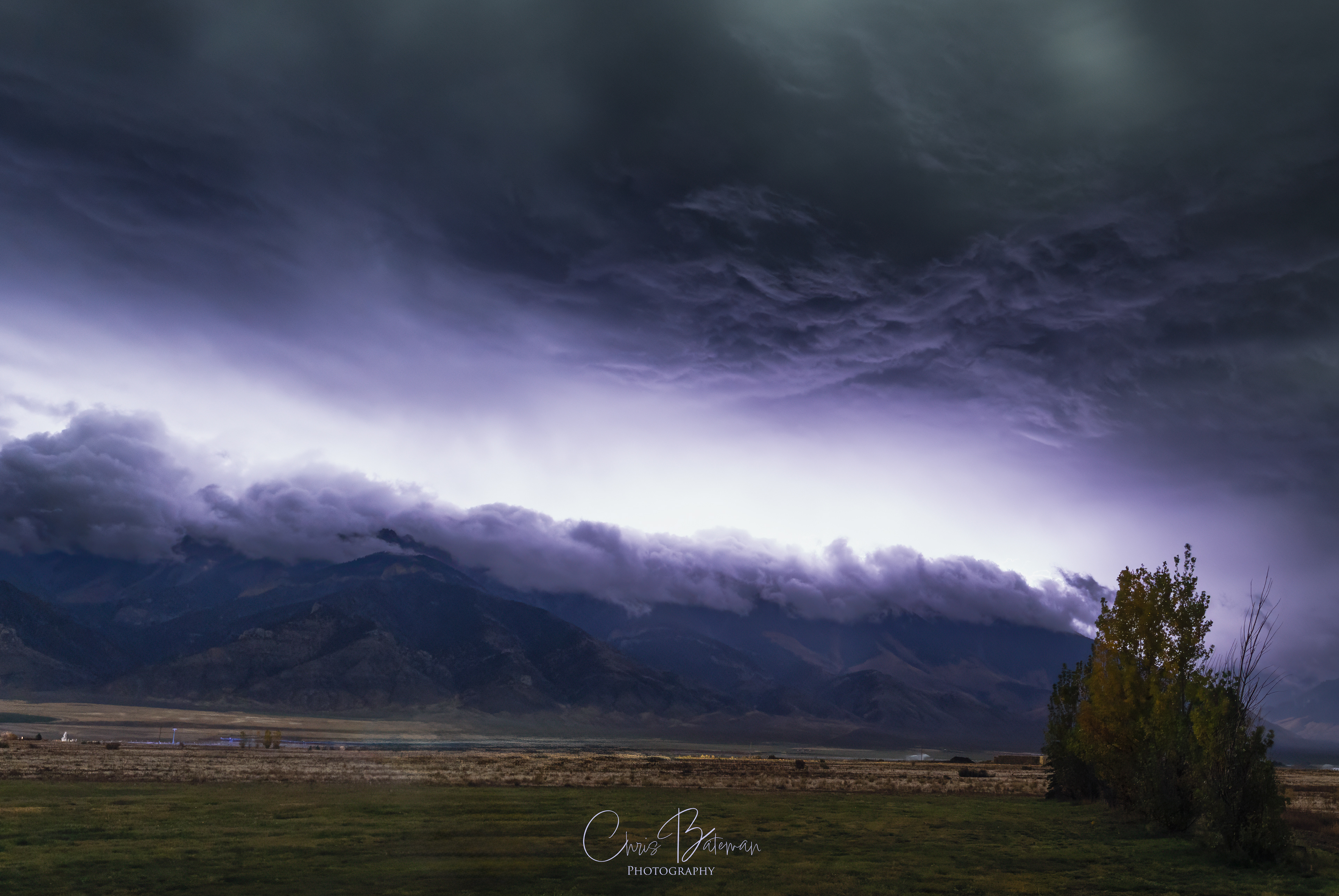This was a 13-second exposure taken around 2:30 AM last night as a storm rolled over the mountains. The whole valley lit up just long enough to show the layers of clouds and mountain ridges underneath.